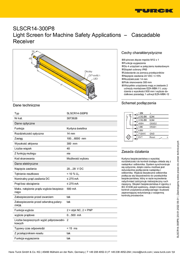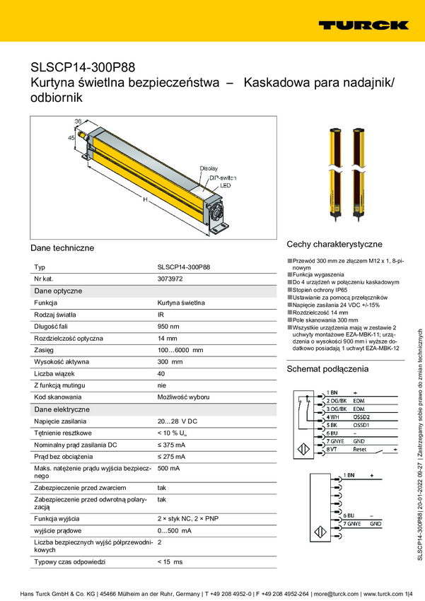 Turck Kurtyna świetlna SLSCP14-300P88 Wysokość ochronna 300 mm
