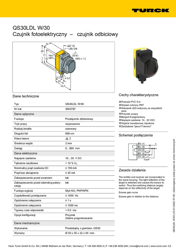 Czujnik dyfuzyjny Turck QS30LDL W/30 3002787 1 szt.
