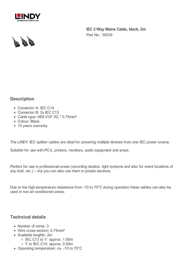 kabel LINDY LINDY 2m IEC C14 auf 2x IEC C13 Y-Netzka 30039, 2.00 m, 1 szt.