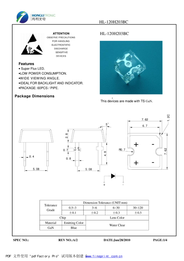 Dioda Super Flux, , 470nm, 300mcd /20mA, kąt 130°, płaska soczewka (Flat type), Honglitronic