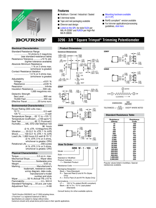 Res Cermet Trimmer 3K Ohm 10% 1/2W 1(Elec)/1(Mech)Turn 2.77mm (6.6 X 6.99 X 4.7mm) Pin Thru-Hole Tube