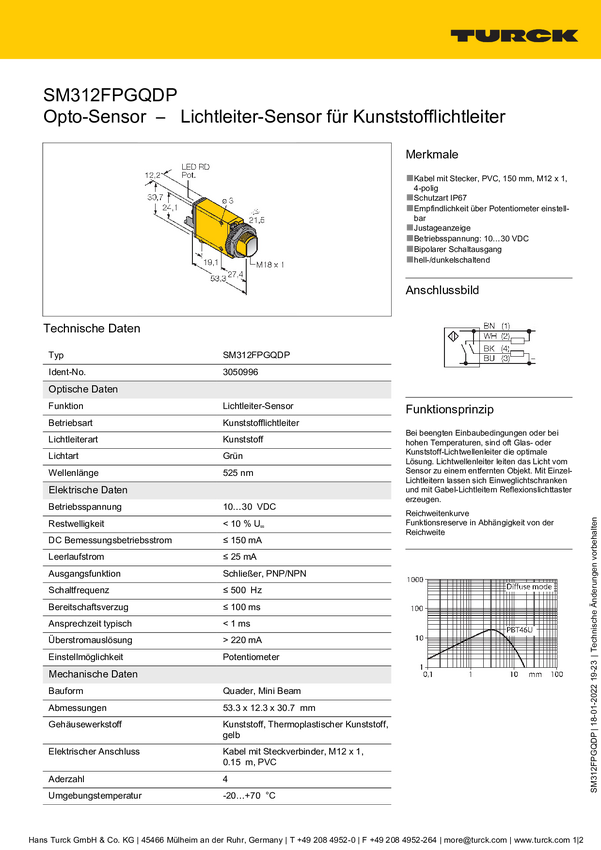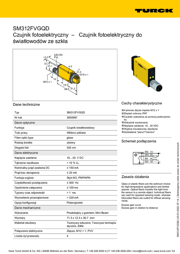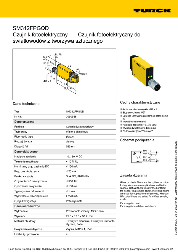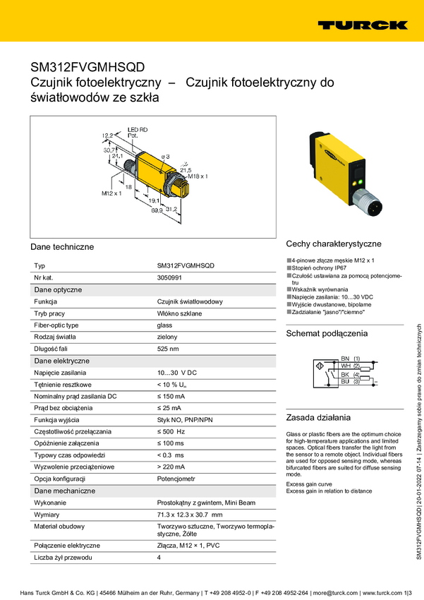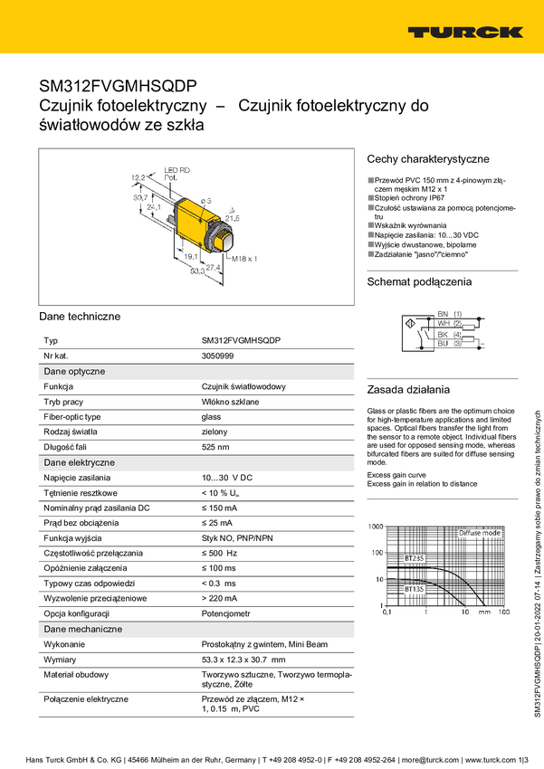 Czujnik światłowodowy Turck SM312FPGQDP 3050996, 1 szt.