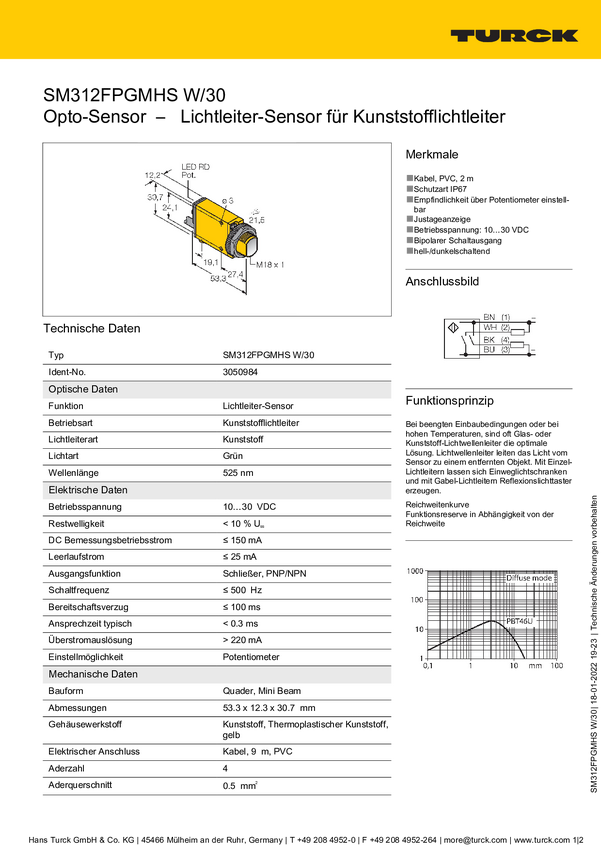 Czujnik światłowodowy Turck SM312FPGMHS W/30 3050984, 1 szt.