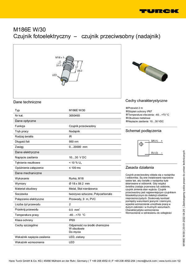 Bezzwrotny czujnik fotoelektryczny Turck M186E W/30 3050465 1 szt.