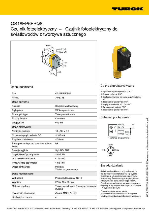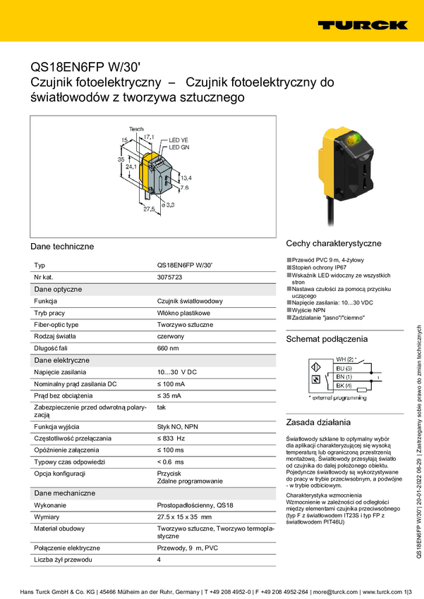 Czujnik światłowodowy Turck QS18EP6FP 3075728 1 szt.