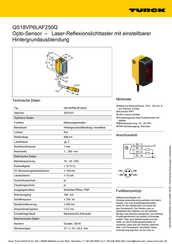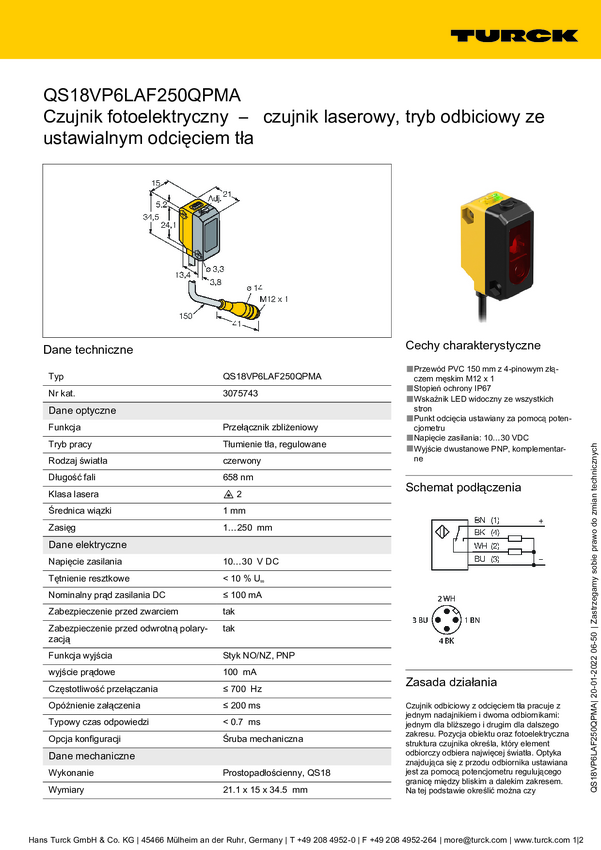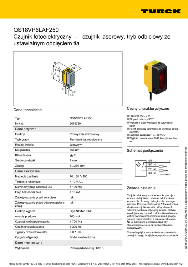 Czujnik dyfuzyjny Turck QS18VP6LAF250 W/30 3075740 1 szt.