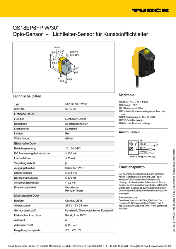 Czujnik światłowodowy Turck QS18EP6FP W/30 3075729, 1 szt.