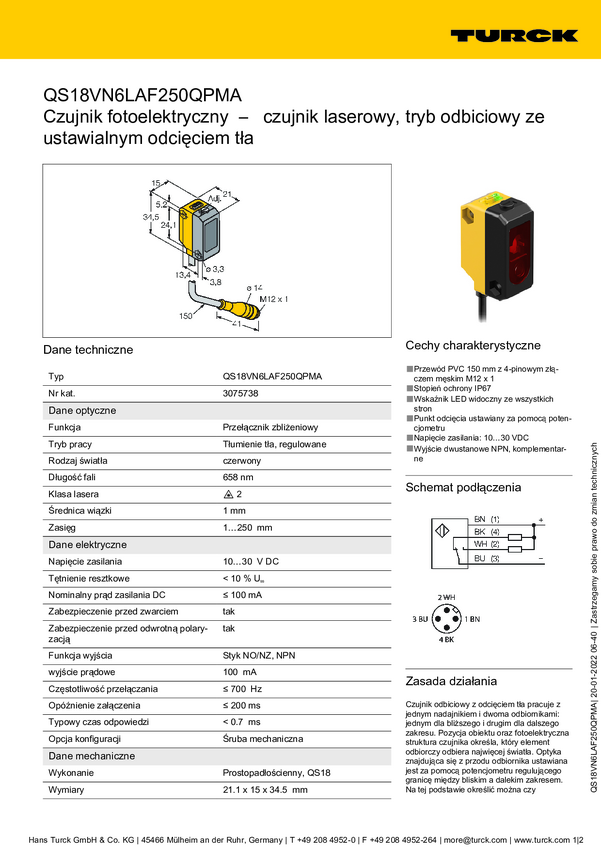 Czujnik dyfuzyjny Turck QS18VN6LAF250 W/30 3075735 1 szt.