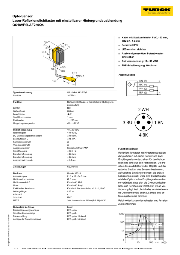 Czujnik dyfuzyjny Turck QS18VP6LAF250 3075739 1 szt.
