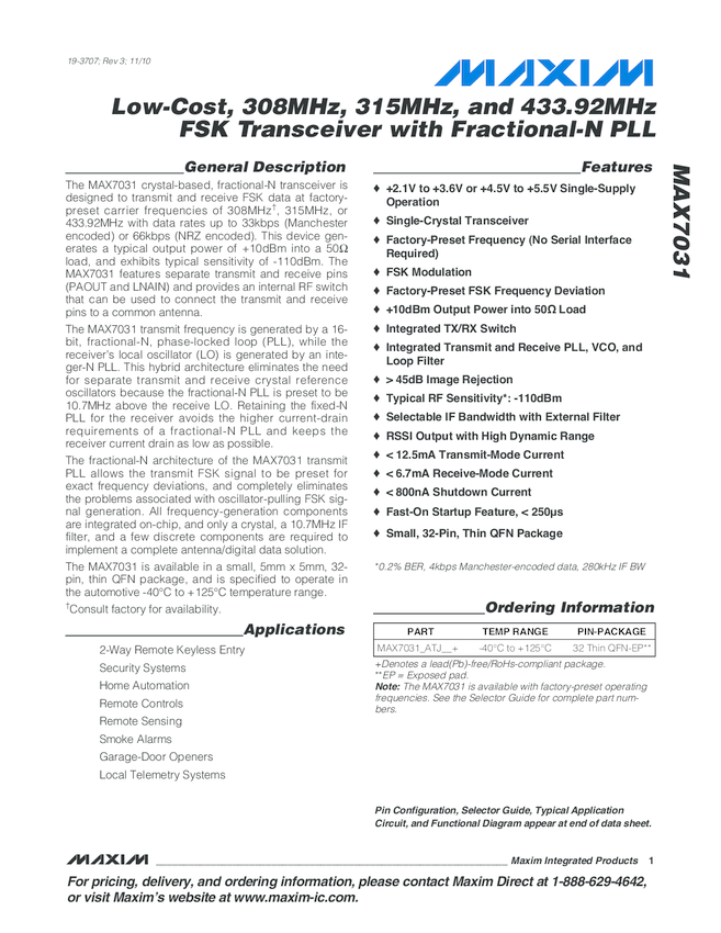 MAX7031 Low-Cost, 308MHz, 315MHz, and 433.92MHz FSK Transceiver with Fractional-N PLL
