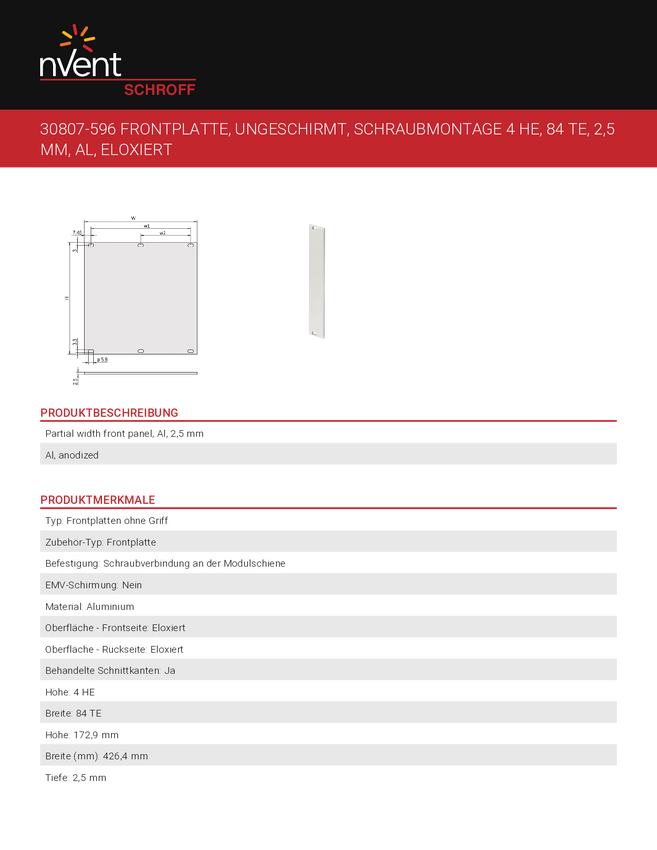 Płytka przednia nVent SCHROFF 30807596 30807596, 1 szt.