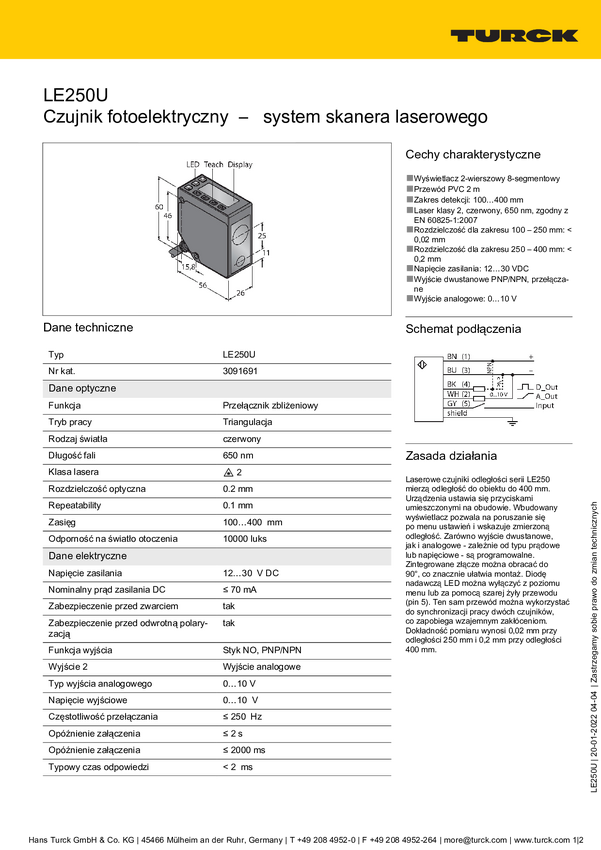Czujnik odległości Turck LE250U 3091691 1 szt.