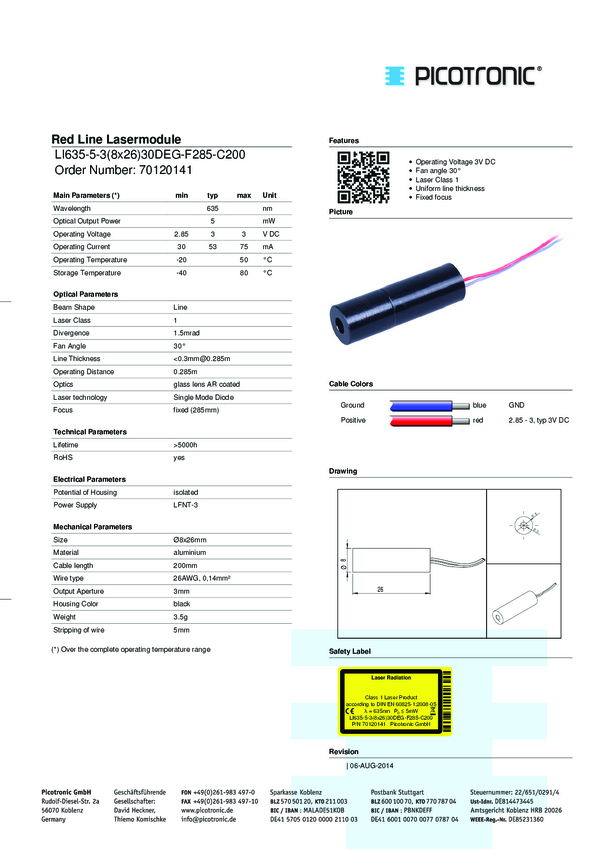 Picotronic Moduł laserowy liniowe czerwony 5 mW LI635-5-3 (8x26) 30DEG-F285-C200