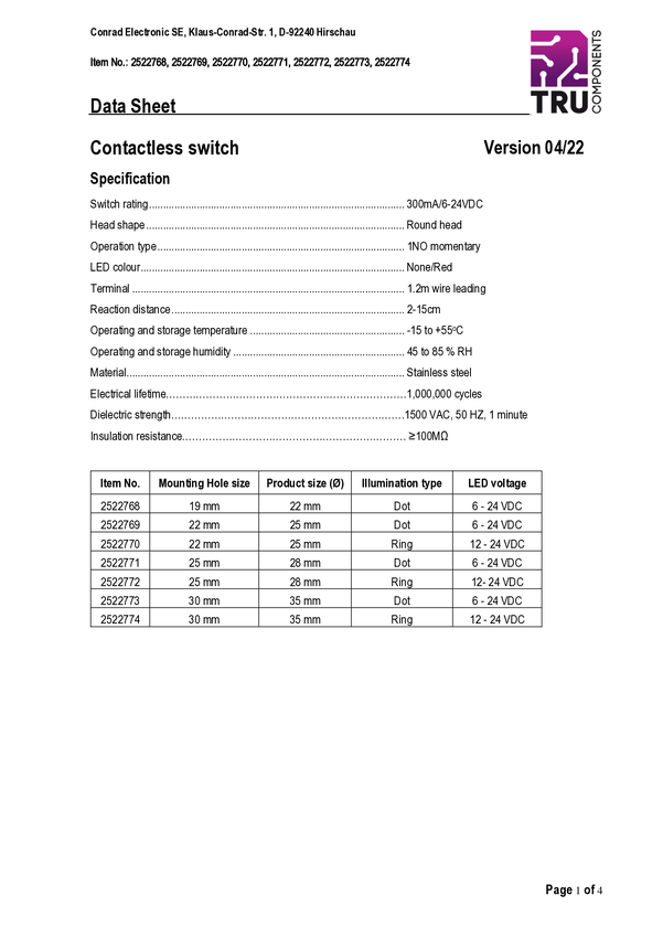 TRU COMPONENTS TC-10091092 Przełącznik bezdotykowy ONPOW91-30D10BYSSNR6-24VDC, 30 mm, 6 V, 24 V, 300 mA, 1 szt.