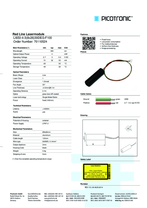 Picotronic 70110524 Moduł laserowy LI650-4-3(8x26)30DEG-F100, klasa 1, 4 mW, 650 nm