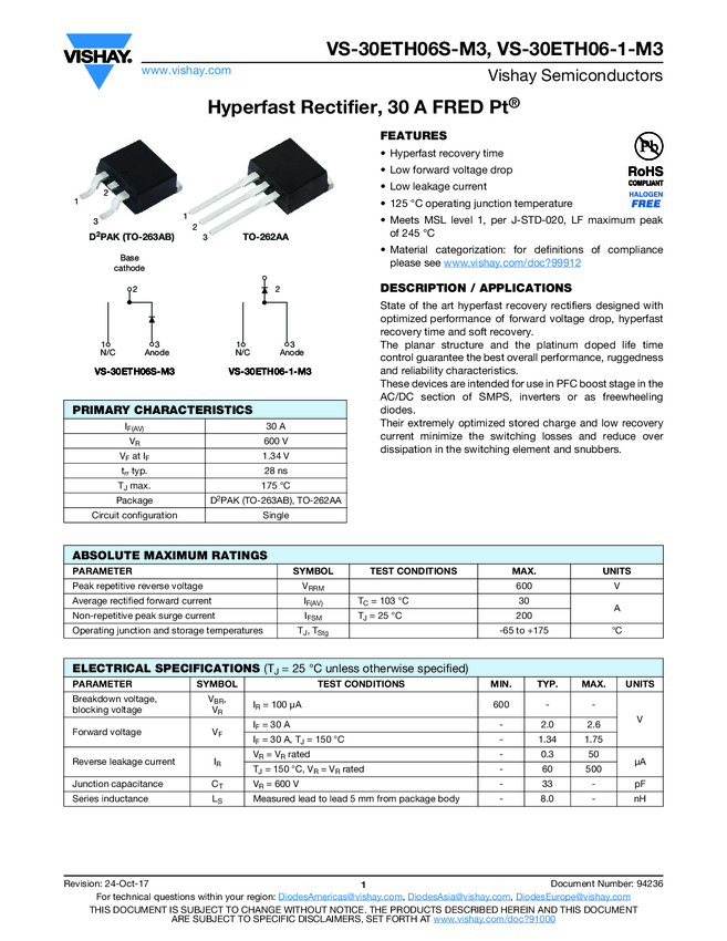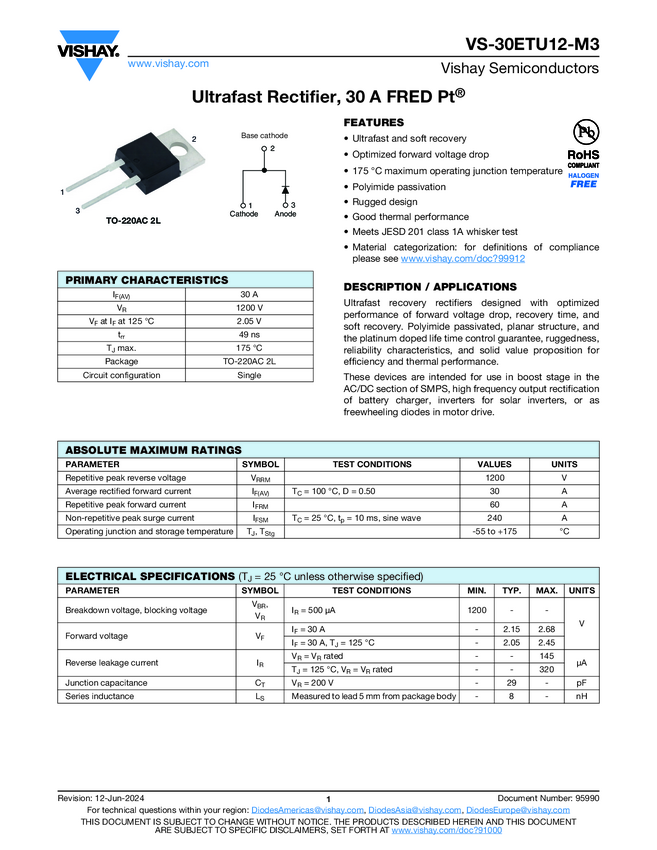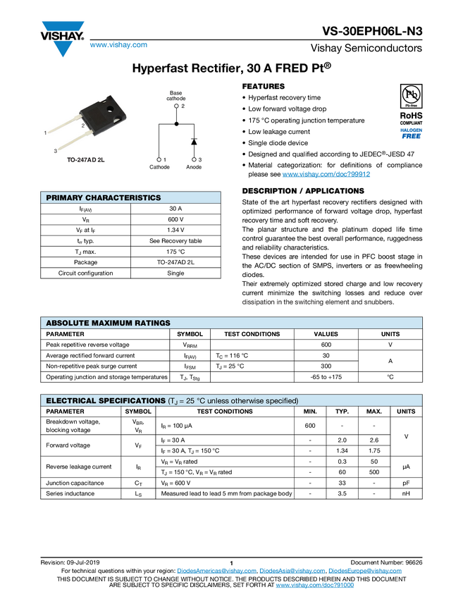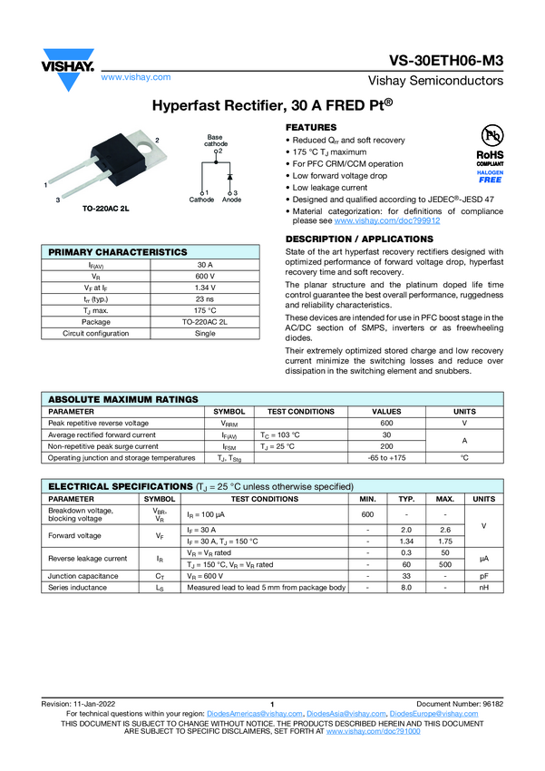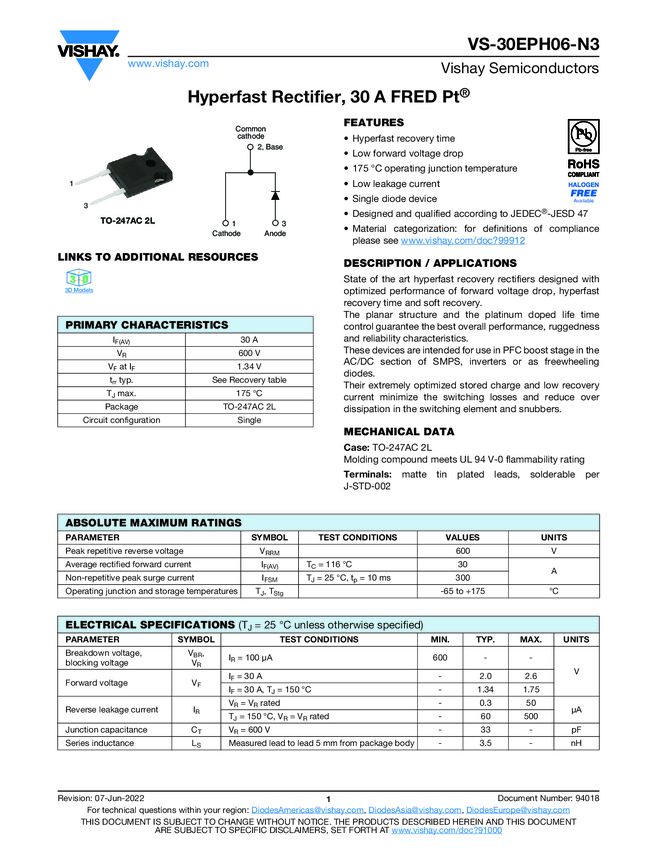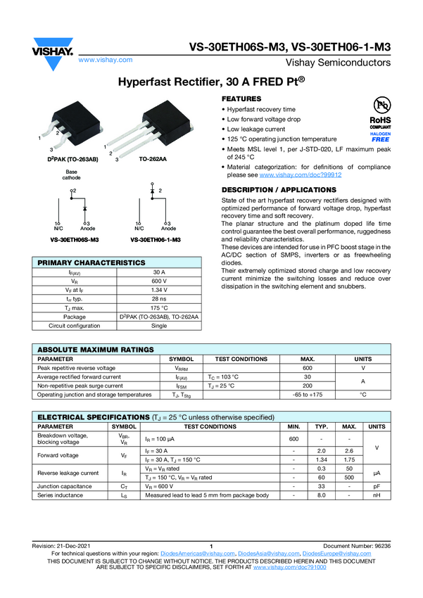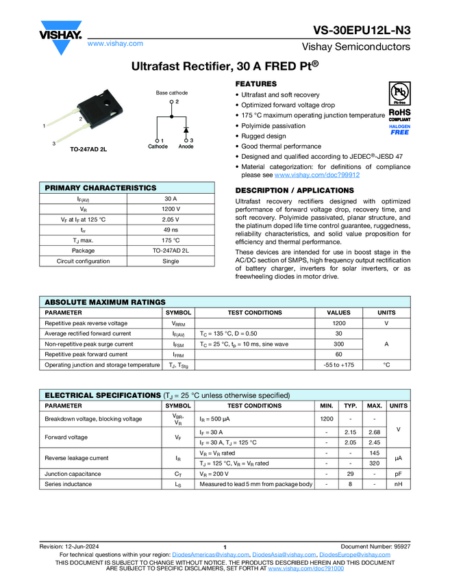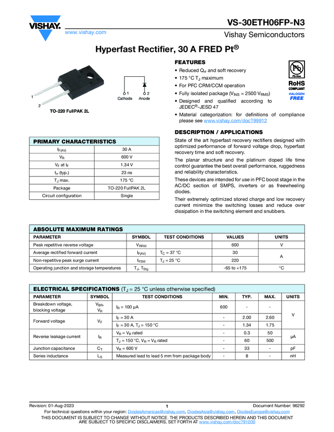 Ultrafast Soft Recovery Diode, 30 A FRED Pt®