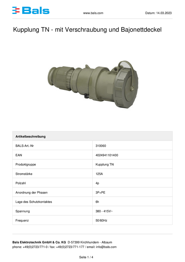 Łacznik CEE Bals Elektrotechnik 310060 125.0 A 400 V