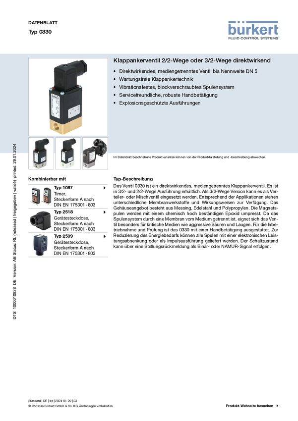 Zawór magnetyczny Bürkert 0330 314402, 0 bar (max)