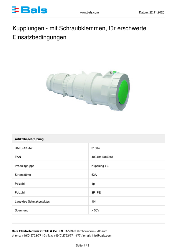 Łacznik CEE Bals Elektrotechnik 3150 63.0 A 230 V