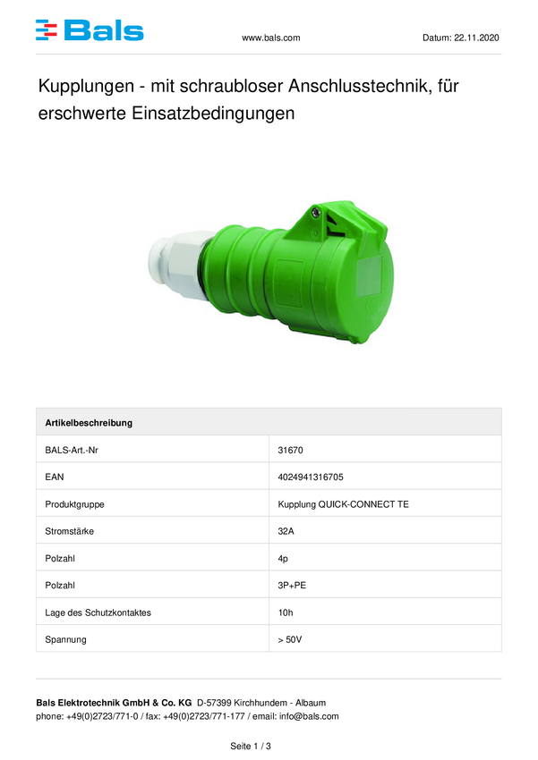 Łacznik CEE Bals Elektrotechnik 31670 32.0 A 500 V