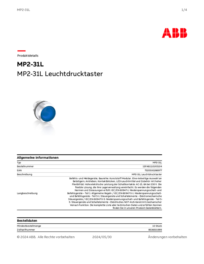 ABB 1SFA611103R3104 MP4-31L Przycisk podświetlany niebieski 1 szt.