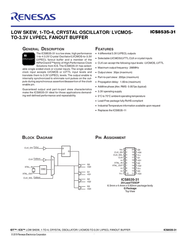Low Skew,1-to-4,Crystal Oscillator/LVCMOS-to-3.3V LVPECL Fanout Buffer