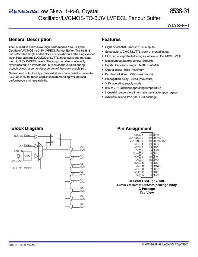 Low Skew,1-to-8,Crystal Oscillator/LVCMOS-to-3.3V LVPECL Fanout Buffer