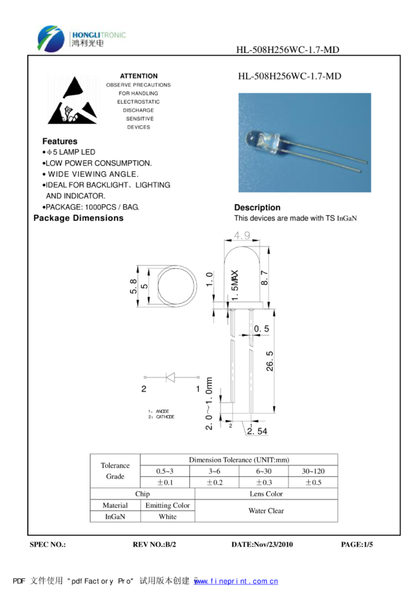 Dioda LED, 5mm, ca 3200K, ultrajasna 2500 mCd, water clear, 60 stopni, Honglitronic