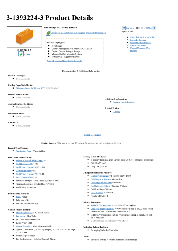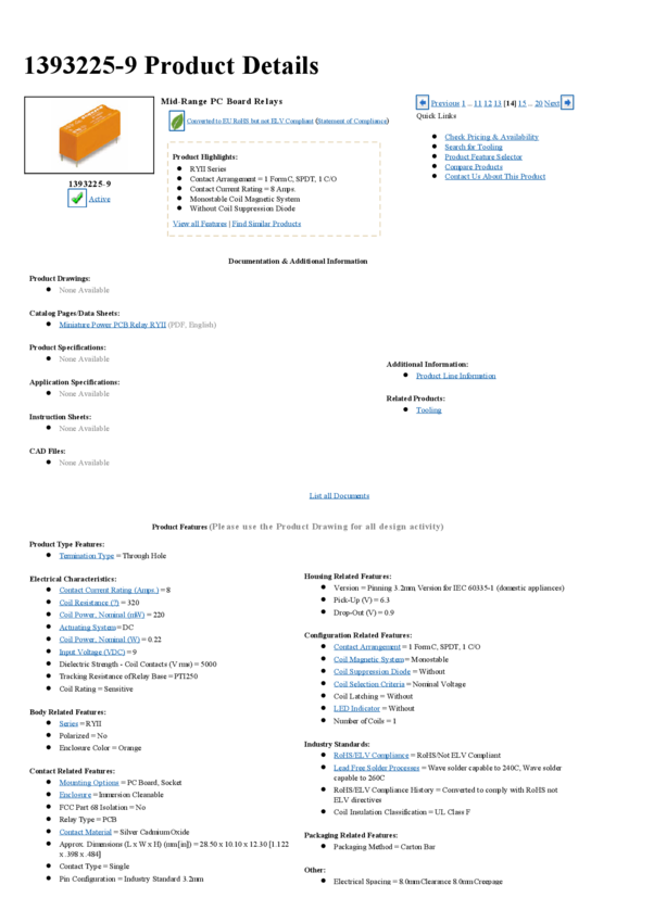 Electromechanical Relay SPDT 1A 12VDC 320Ohm Through Hole
