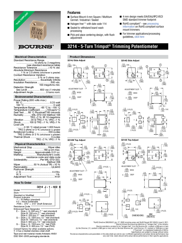 Res Cermet Trimmer 5K Ohm 10% 1/4W 5(Elec)Turn 1.5mm (4.8 X 3.9 X 5.3mm) J-Hook SMD