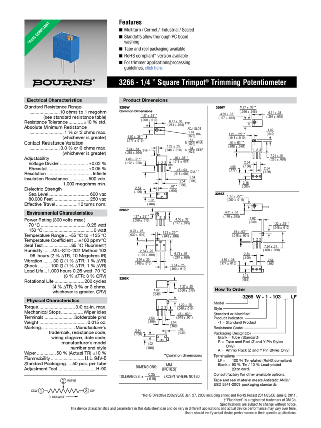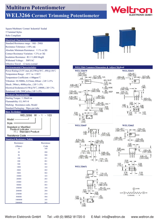 Potencjometr wieloobrotowy Weltron WEL3266-W-102-LF, 6mm 1K 10% 0.25W 3266W
