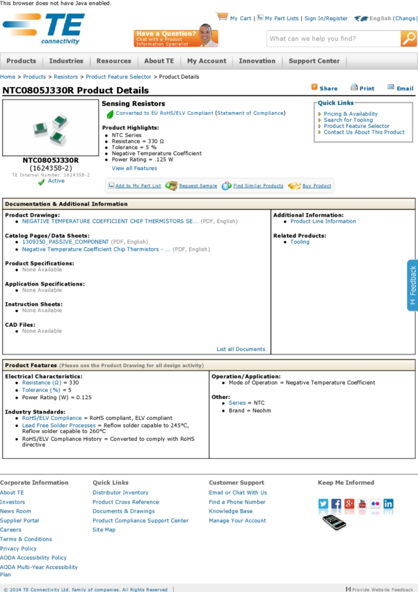 Thermistor NTC 330Ohm 5% 2-Pin 0805 T/R