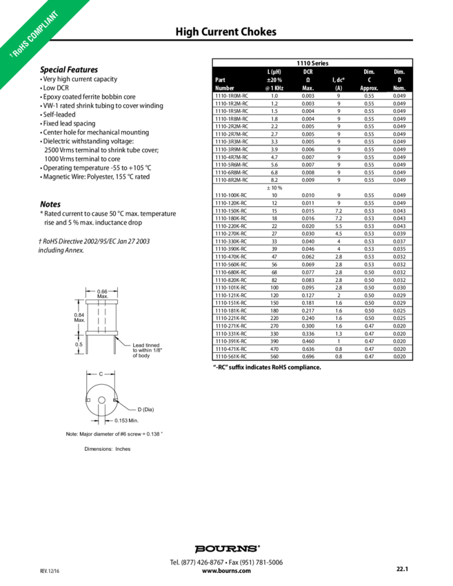 Ind High Current RF Choke Bobbin Core 330uH 10% 1KHz Ferrite 1.3A RDL