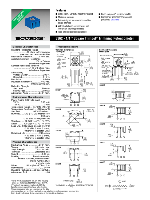 Bourns 3362P-1-500LF 3362P-1-500LF Potencjometr suwakowy, studyjny zamknięty liniowa 0.5 W 50 Ω 240 ° 270 ° 1 szt.