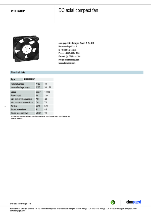 DC Fan Ball Bearing 48V 120W 11000RPM 336CFM 78dB Flange Mount