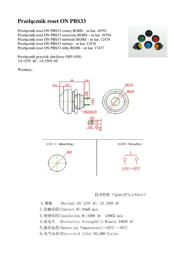Przełącznik; przyciskowy; PBS-33B/B; OFF-(ON); 1 tor; czarny; 1A; 250V AC; 12mm; lutowany; RoHS