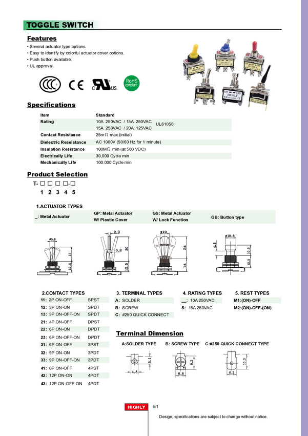 Przełącznik; dźwigniowy; T-33BS; ON-OFF-ON; 3 tory; 3 pozycje; 9 pin; na panel; śrubowe; 15A; 250V AC; 29mm; Highly; RoHS