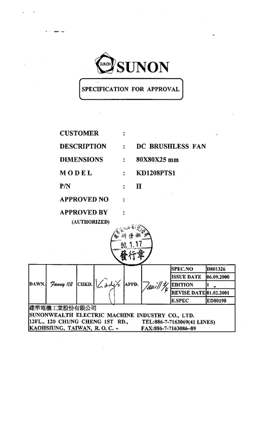 Wentylator 24V 80x25 G 62m3/h 33dB 1,7W nadruk KD2408PTS1 13.A.GN DC24V 1.7W ZP CLX