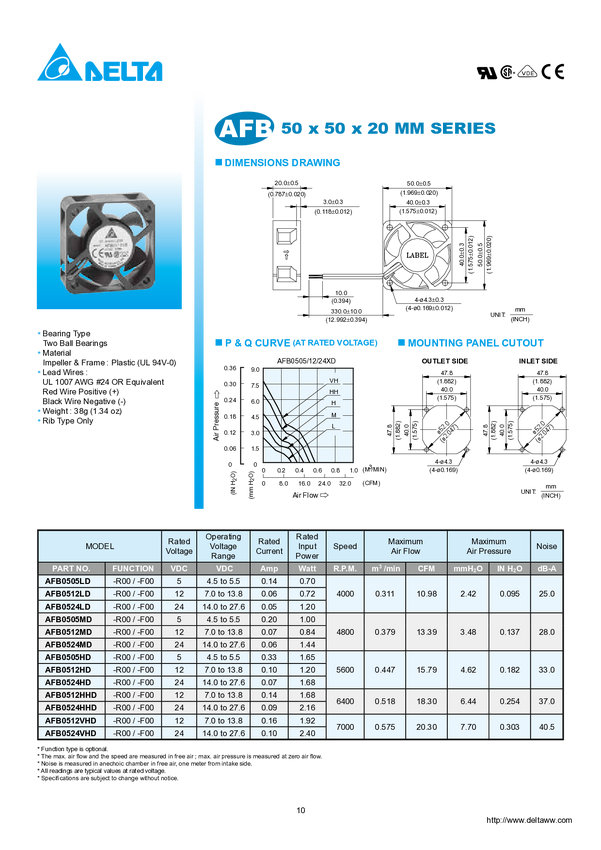 Wentylator50x50x20mm; dwa łóżyska kulkowe; Red wire Positive(+); Black wire Negative(-) 12V DC(7-13,8V) Prąd I=0,1A; moc P=1,2W; 5600 RPM; 0,447m3/min; 33dBA Wentylator Delta