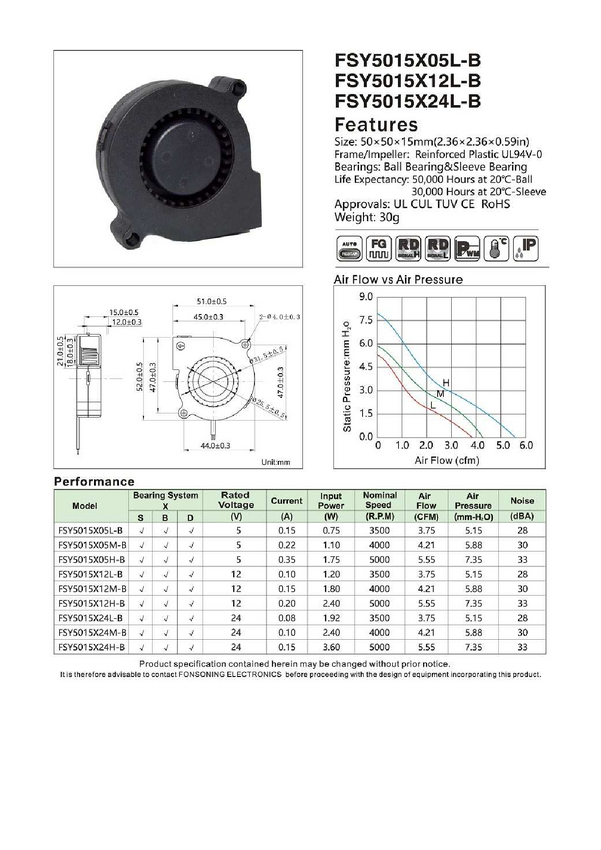 Dmuchawa wentylatorowa; FSY5015S12H; 50x50x15mm; 12V; DC; 5,55m3/h; 33dB; 150mA; 5000RPM; 2 przewody; 150mm; FONSONING; RoHS