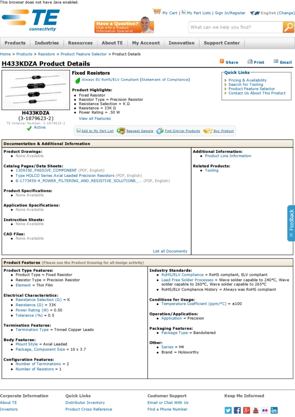 Res Metal Film 33K Ohm 1% 1/4W ±50ppm/°C Conformal AXL Thru-Hole Bandoliered