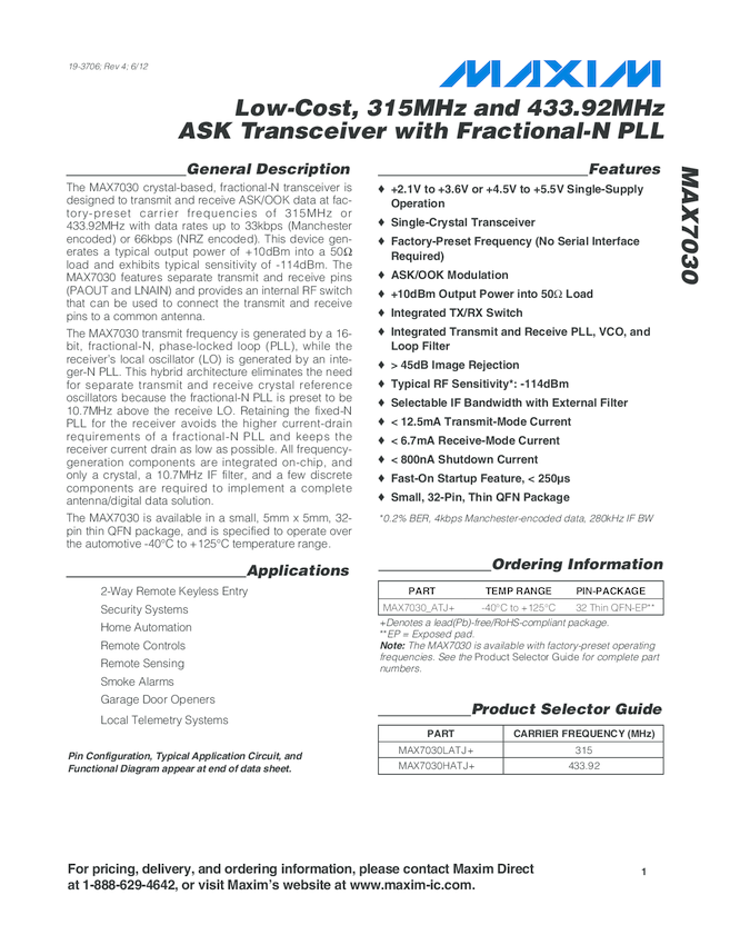 MAX7030 Low-Cost, 315MHz, 345MHz, and 433.92MHz ASK Transceiver