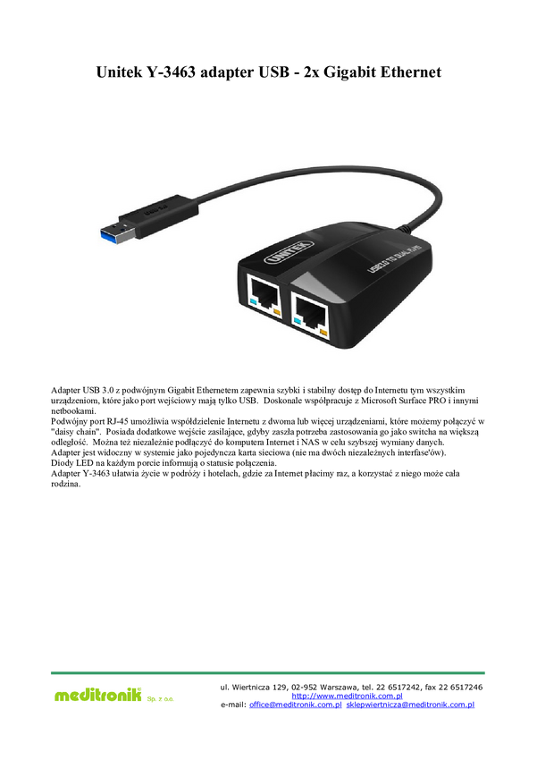 Unitek Y-3463 adapter USB - 2x Gigabit Ethernet