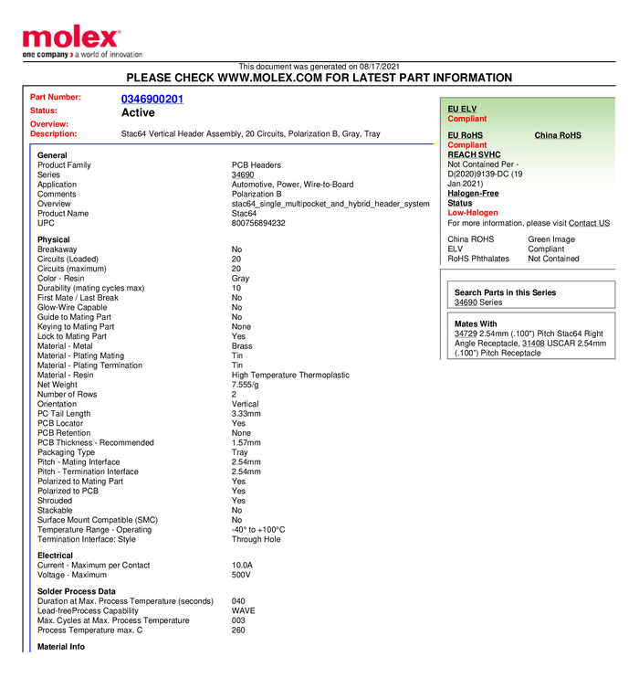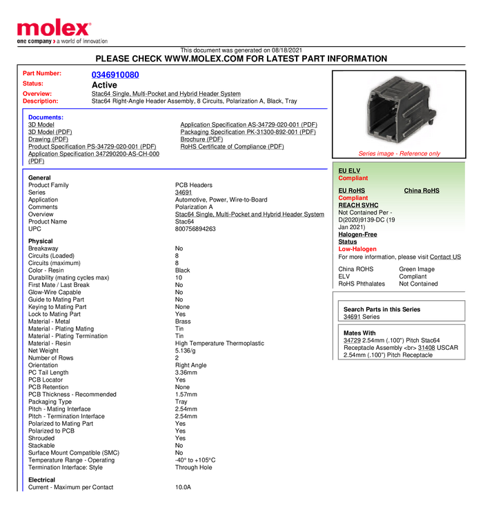Molex 346910080 Listwa kołkowa, męska, do wbudowania, standardowa 1 szt.