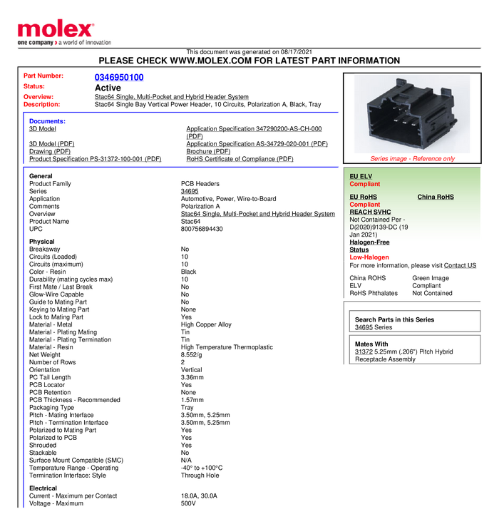 Molex 346950100 Listwa kołkowa, męska, do wbudowania, standardowa Molex MOL Automotive, piny: 10, NaN A, 1 szt.