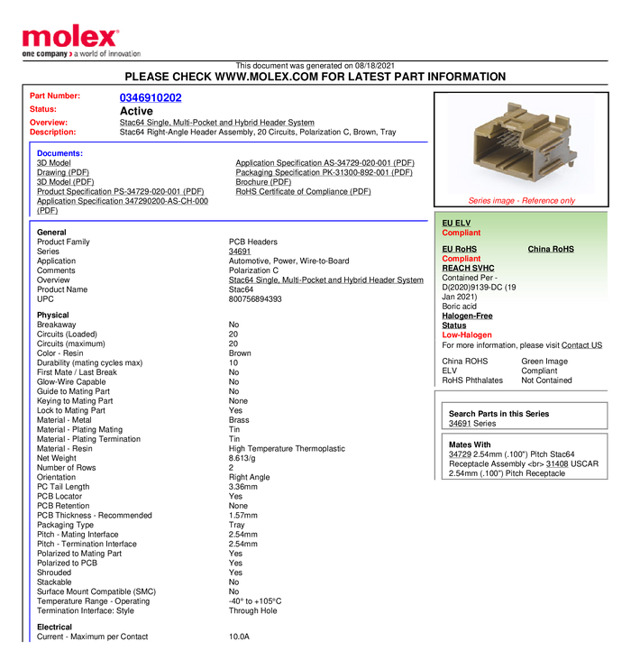 Molex 346960101 Listwa kołkowa, męska, do wbudowania, standardowa Molex MOL Automotive, piny: 10, NaN A, 1 szt.