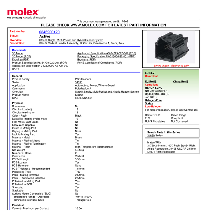 Molex 346900120 Listwa kołkowa, męska, do wbudowania, standardowa 1 szt.