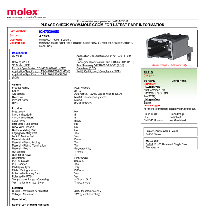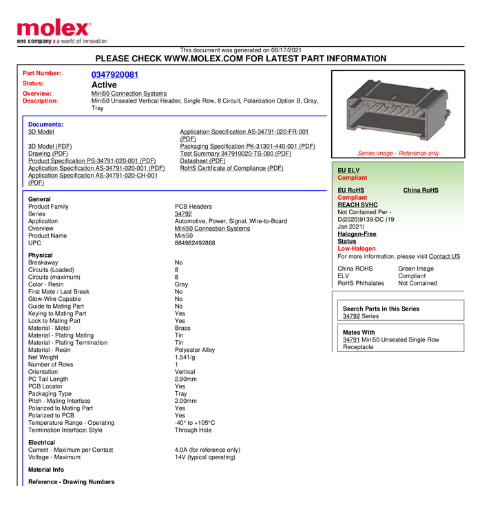Molex 347920081 Listwa kołkowa, męska, do wbudowania, standardowa Molex MOL Automotive, piny: 8, 4 A, 1 szt.