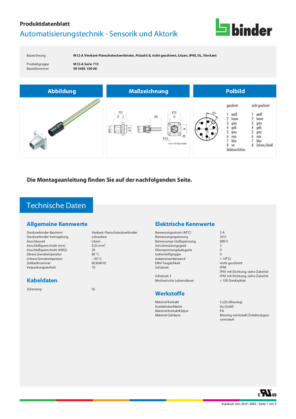 binder 99 3483 100 08 Złącze konfekcjonowane czujnika/aktuatora, 1 szt.