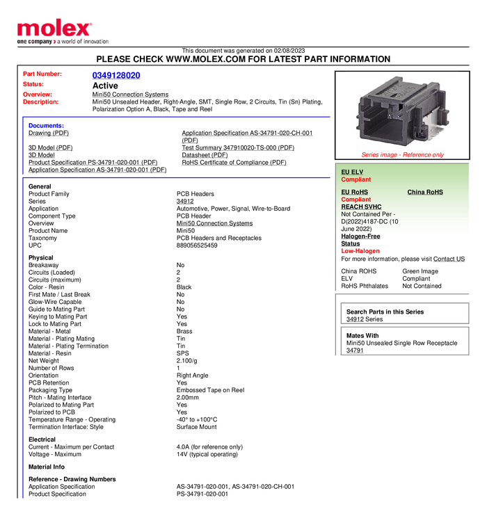 Molex 349128020 Listwa kołkowa, męska, do wbudowania, standardowa, piny: 2, 1 szt.